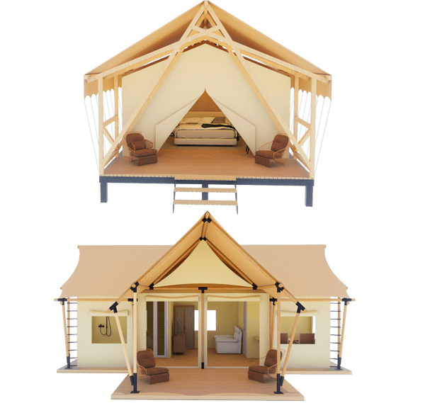 主打高端自然體驗(yàn),將荒野景觀與奢華設(shè)施結(jié)合,配備星空頂、恒溫浴缸及定制服務(wù),帳篷框架采用防風(fēng)鋁材,融入原生態(tài)設(shè)計(jì),打造私密野奢秘境。